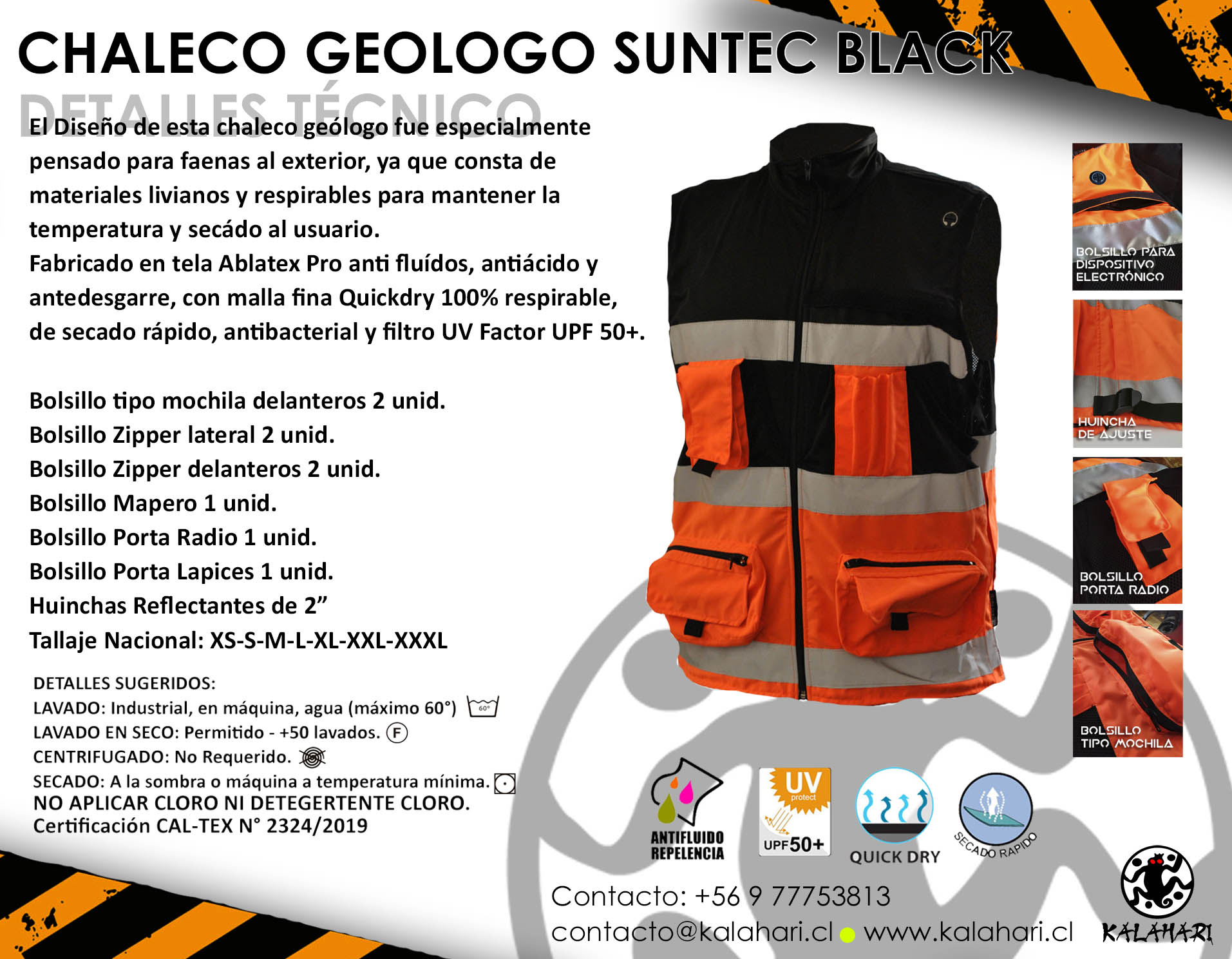 El Diseño de este chaleco geólogo fue especialmente pensado para faenas al exterior, ya que consta de materiales livianos y respirables para mantener la temperatura y secado al usuario.